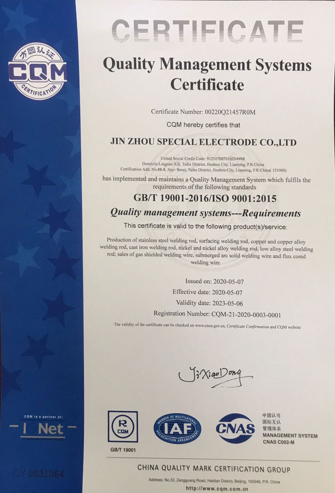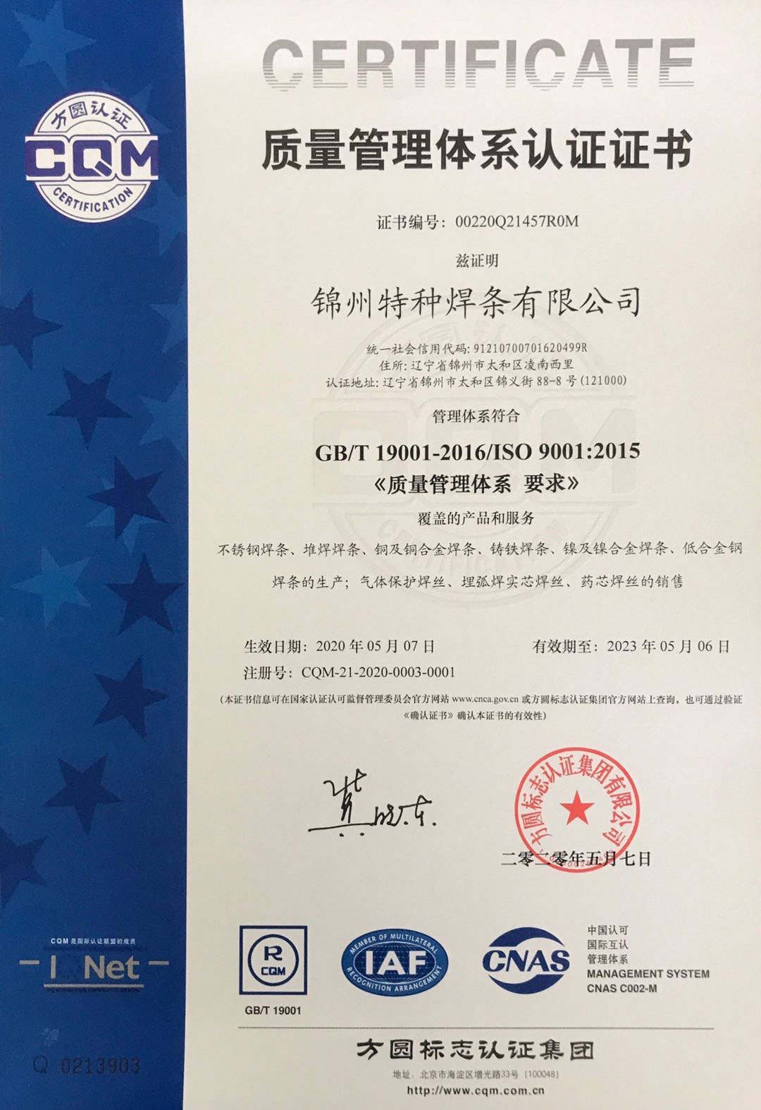 認(rèn)證名稱:Quality Management Systems Certificate
